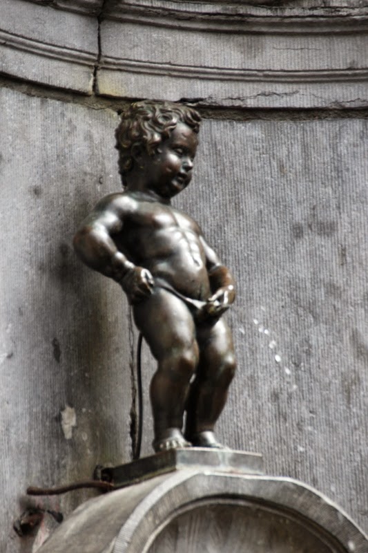 Die 39 cm hohe Bronzestatue ist nicht der Rede wert. Trotzdem scharren sich die Touristen um einen dieser wenigen letzten originären Stadtbrunnen, während sie dabei eine der typische Brüsseler Waffeln vertilgen.