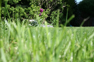 Rasen ist folglich nicht mein Ding. Ich weigere mich. Was nicht funktioniert, wenn er mal nicht da ist und das satte Grün wie bekloppt im Sekundentakt wuchert, weil Mann es morgens vertikutiert, gelüftet, geharkt, mittags gedüngt, gehätschelt, gegossen und nachts bei Mondschein esotherisch mit einer Mischung aus ökologisch astreinem Weizen und biosphärischem Hopfen bequatscht hat. Glaube ich zumindest.